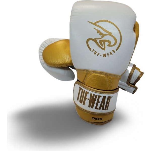 Echte Rocky Balboa Fans kennen TUF WEAR – die Marke, die echte Champions ausstattet, im Film und in der Realität. Wer sich für ein anspruchsvolles Training ausstatten möchte, wählt diese hochwertigen TUF WEAR CREED Leder Boxhandschuhe. Sie wurden aus langlebigem Premium-Rindsleder gefertigt, das besonders robust und unempfindlich ist. Eine mehrschichtige Polsterung aus hochdichtem Schaumstoff absorbiert auch die kräftigsten Schläge. Ein doppelter Klettverschluss sorgt für sicheren Halt am Handgelenk, während die extra lange Manschette ein eng anliegendes und bequemes Tragegefühl ermöglicht. Das zweifarbige Design mit goldfarbenen Details gibt den TUF WEAR CREED Leder Boxhandschuhen eine edles Finish. Wie gemacht für echte Sieger!TUF WEAR CREED Leder Boxhandschuhe ideal für