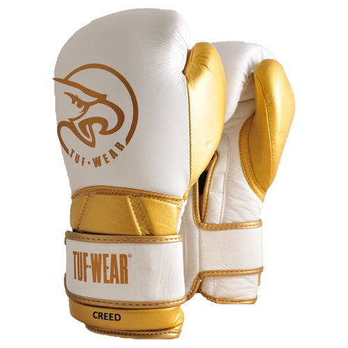Echtes Rindsleder als Obermaterial, IMF als Polsterung, extra sicherer Schutz und Halt am Handgelenk – und dann auch noch das exklusive Design. Die CREED Leder Boxhandschuhe von TUF WEAR sind wahrlich für echte Sieger gemacht! Das zweifarbige Design mit goldfarbenen Details gibt den CREED Boxhandschuhen ein edles, auffälliges Finish und unterstreicht die Wertigkeit dieses Modells. Jeder wird sehen: Du hast die richtige Wahl getroffen!